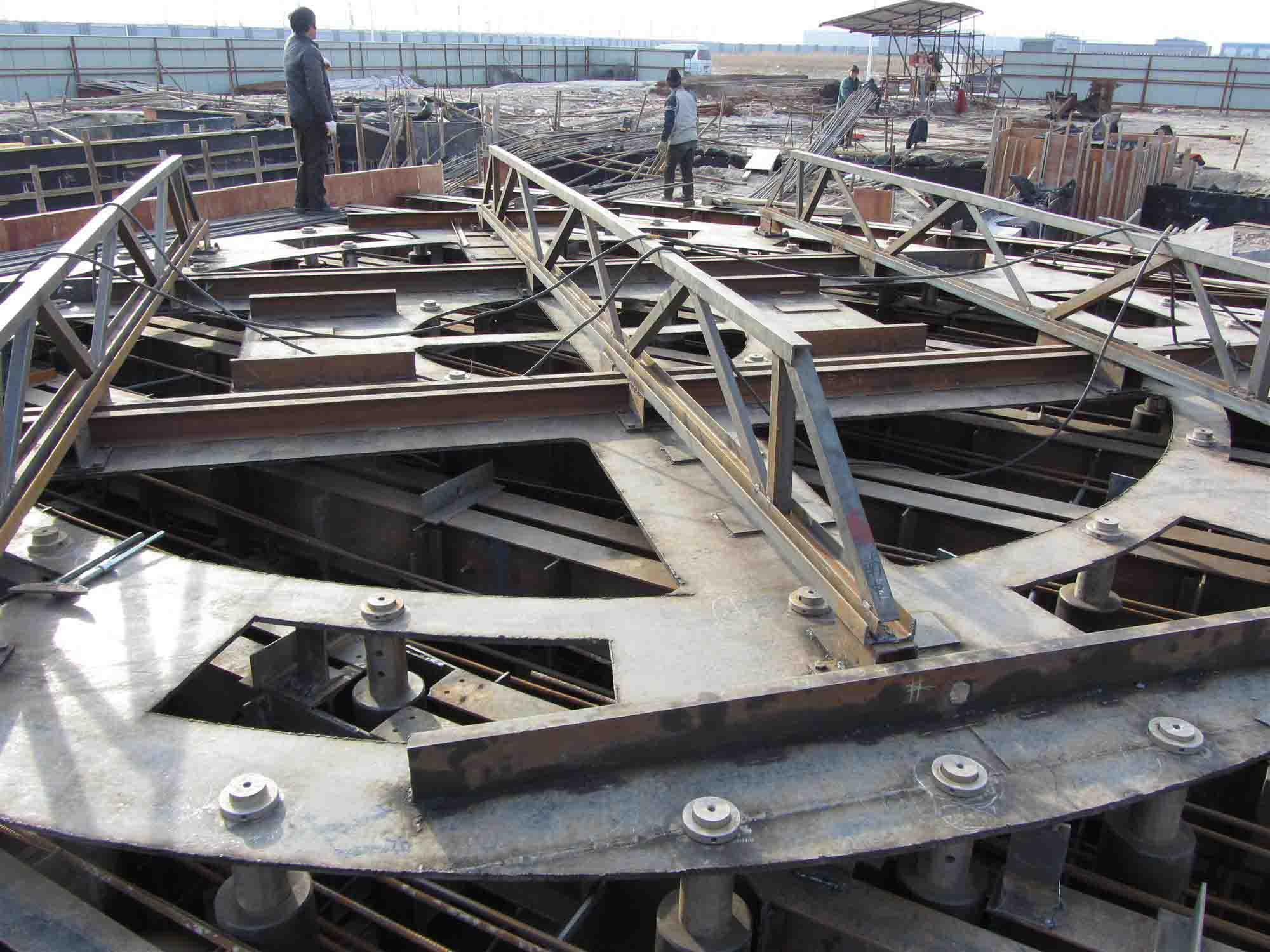 公司獨創(chuàng)的大體積混凝土設(shè)備基礎(chǔ)錨栓群逆作預埋施工工法,被河北省住房和城鄉(xiāng)建設(shè)廳批準為2014年度河北省省級工程建設(shè)工法。公司通過采用自行設(shè)計的大型定位工具,將預埋錨栓定位精度提高到0.5毫米的控制量級,高于國家標準GB504-2002《混凝土結(jié)構(gòu)工程施工質(zhì)量驗收規(guī)范》的1毫米精度。
